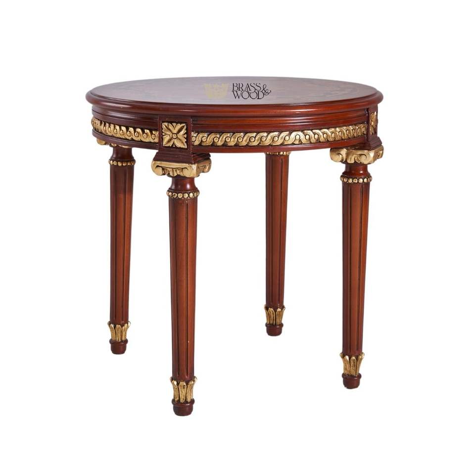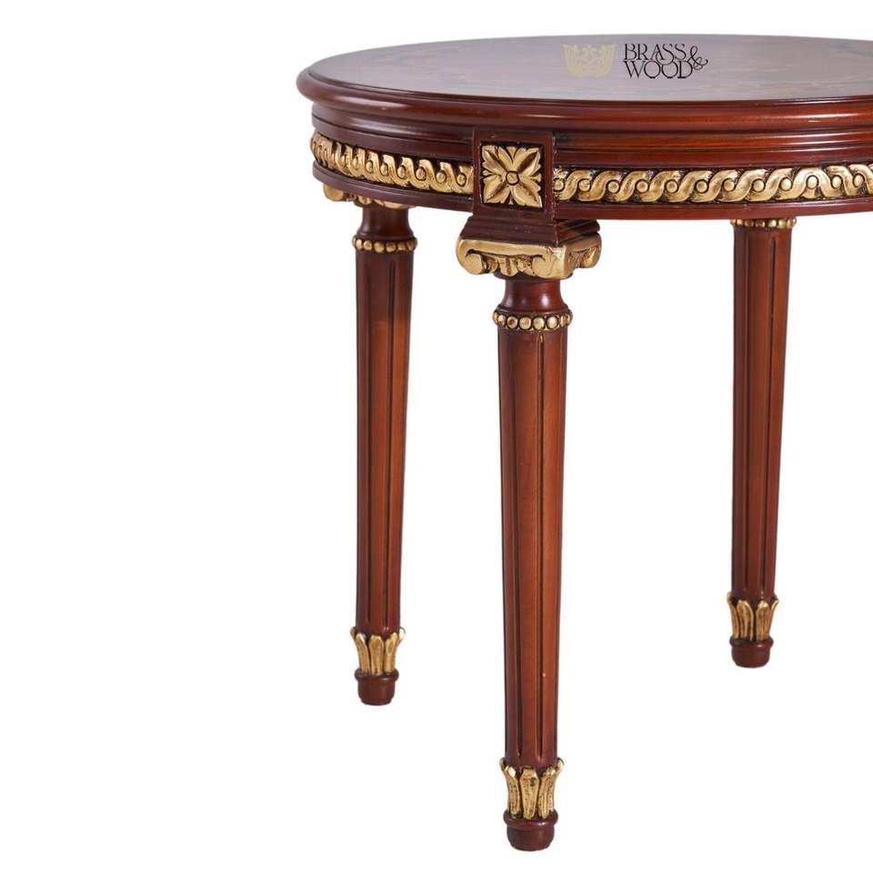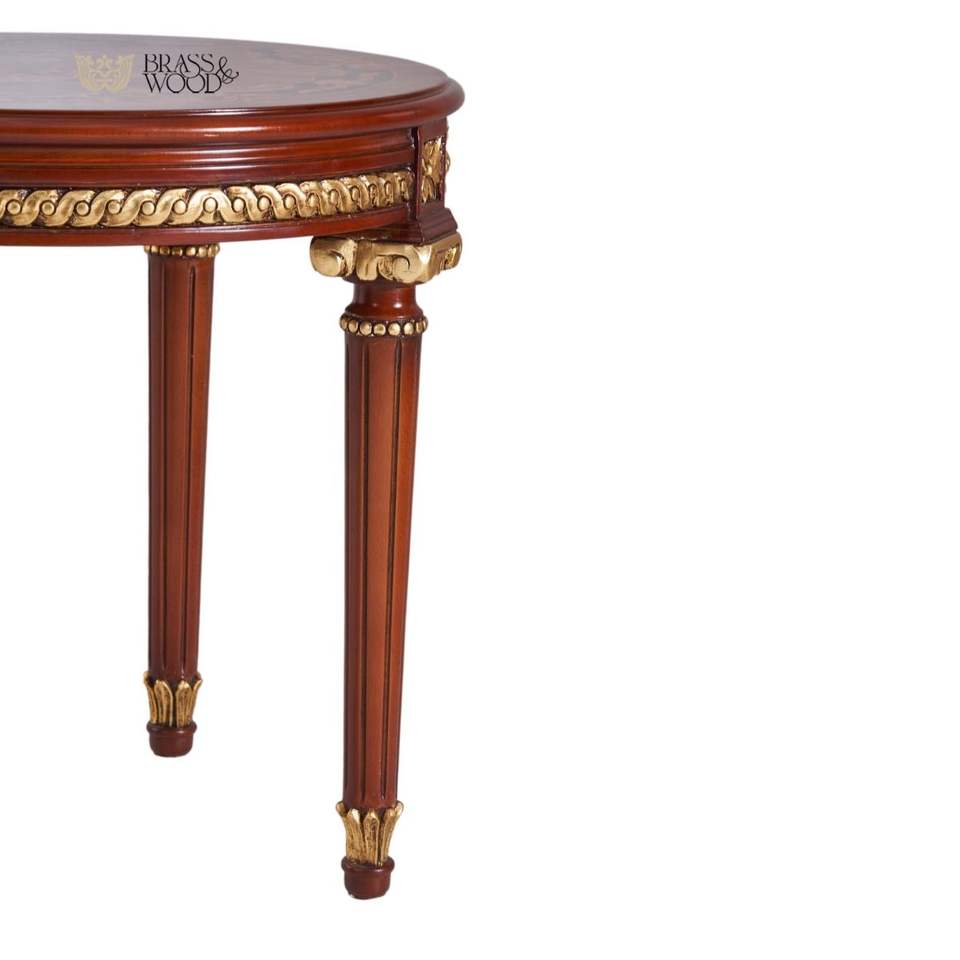 Table d'appoint ronde de luxe en acajou avec incrustation florale en marqueterie et accents en feuille d'or ornée pour la décoration d'angle de maison classique