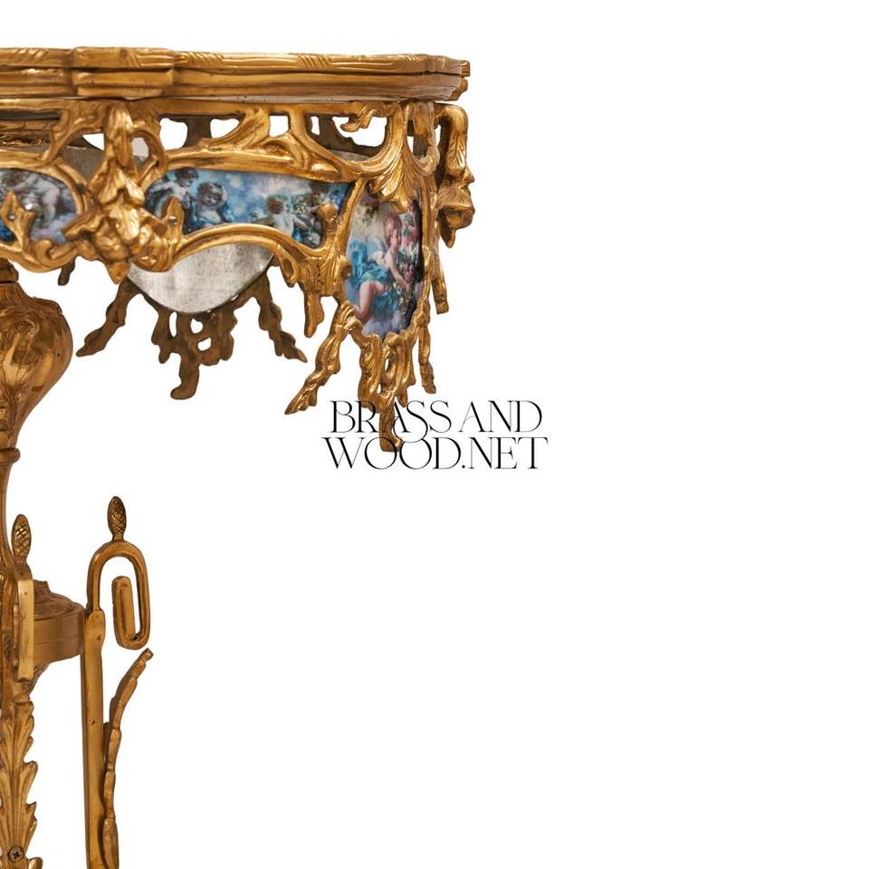 Table d'appoint ronde de luxe avec plateau en marbre, piétement en laiton antique orné et panneaux en porcelaine de style Sèvres peints à la main