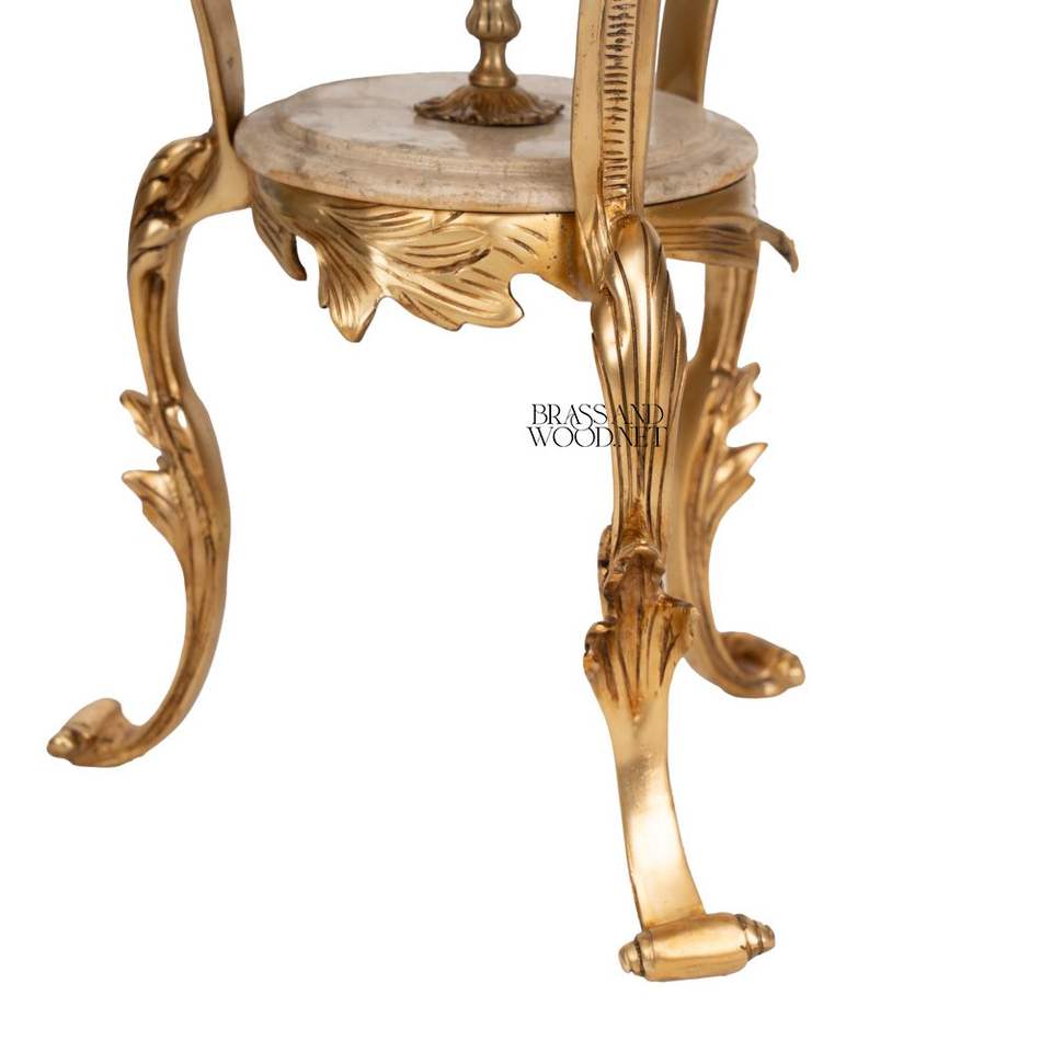Table d'appoint ronde de luxe à deux niveaux avec plateau en marbre beige naturel et cadre en laiton doré orné de feuilles pour la décoration intérieure des palais