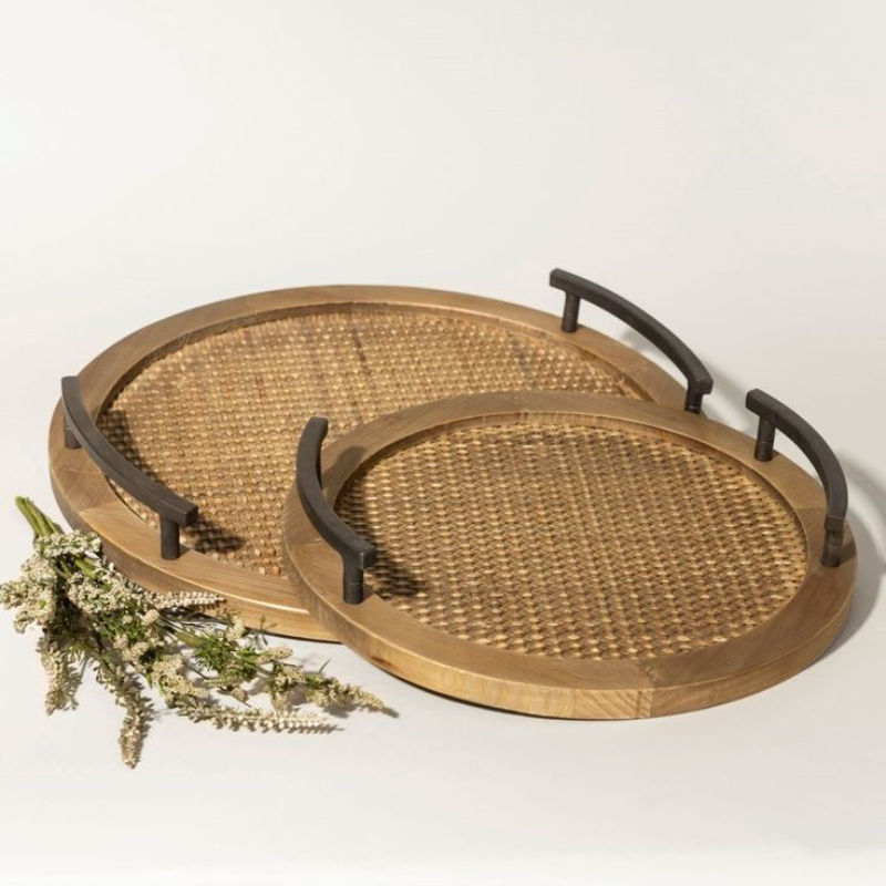 Plateaux ronds en bois de luxe avec design en rotin Parfaits pour la décoration de la maison Vaisselle de cuisine Service Vaisselle élégante Utilisation Ensemble de 2 pièces