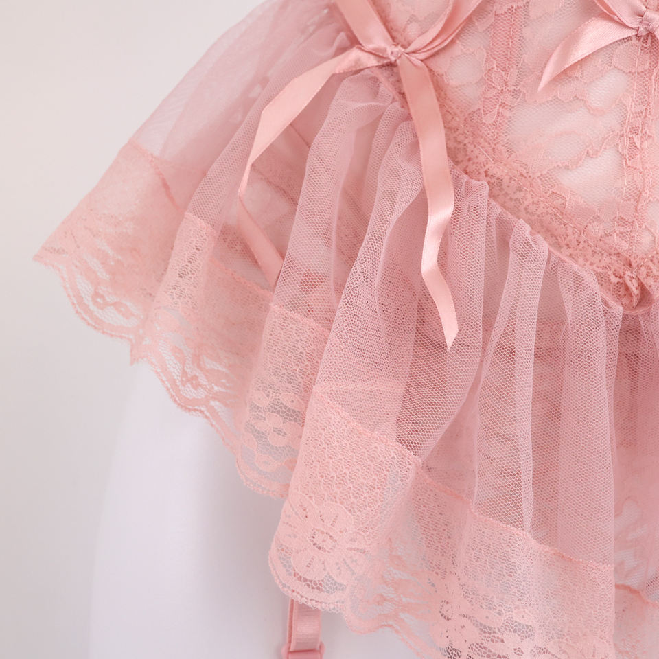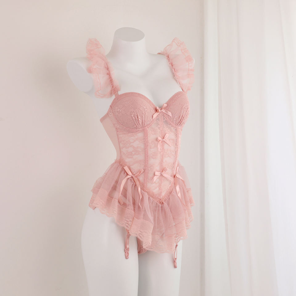 Ensemble de Lingerie sensuelle de luxe soutien-gorge Corset en arête de poisson de Style français avec porte-jarretelles en dentelle en maille transparente string à dos en T Lingerie Sexy pyjamas