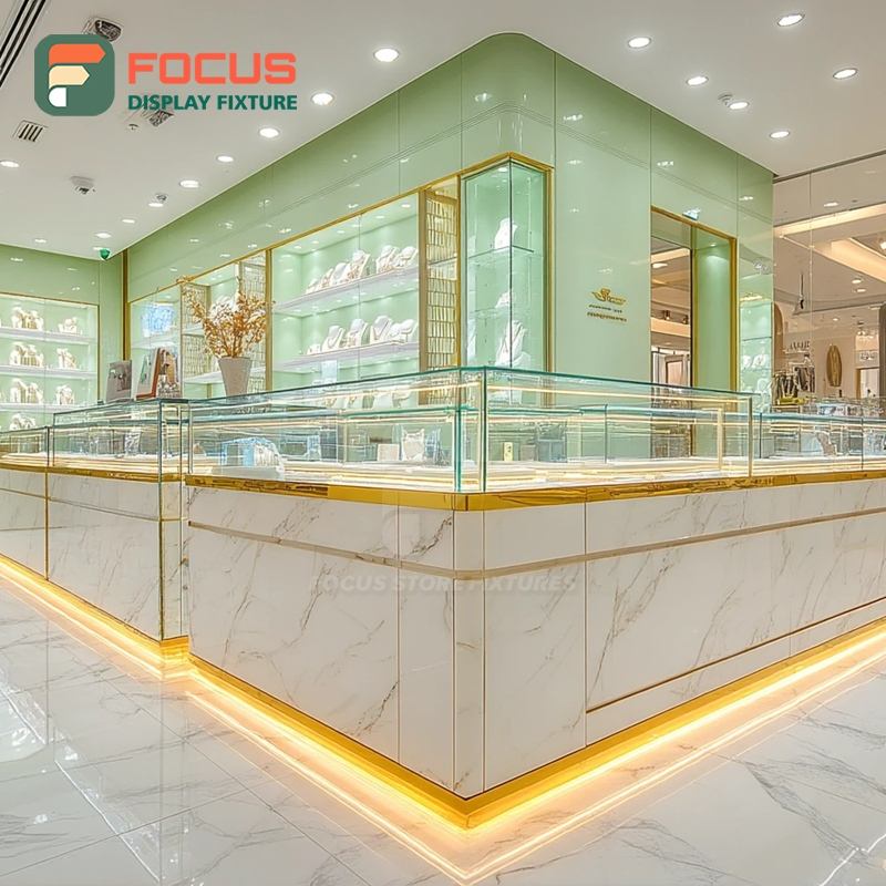 Vitrine de luxe pour centre commercial, présentoir à bijoux finition stratifiée, comptoir de présentation pour bijouterie