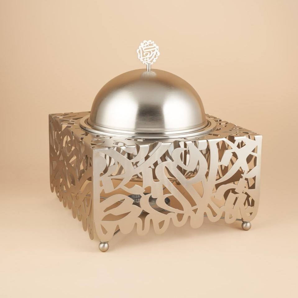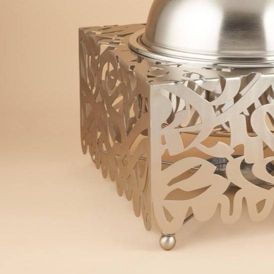 Plat à chafing carré de luxe en acier inoxydable argenté avec motif ajouré arabe pour le service de buffet et la restauration du Ramadan