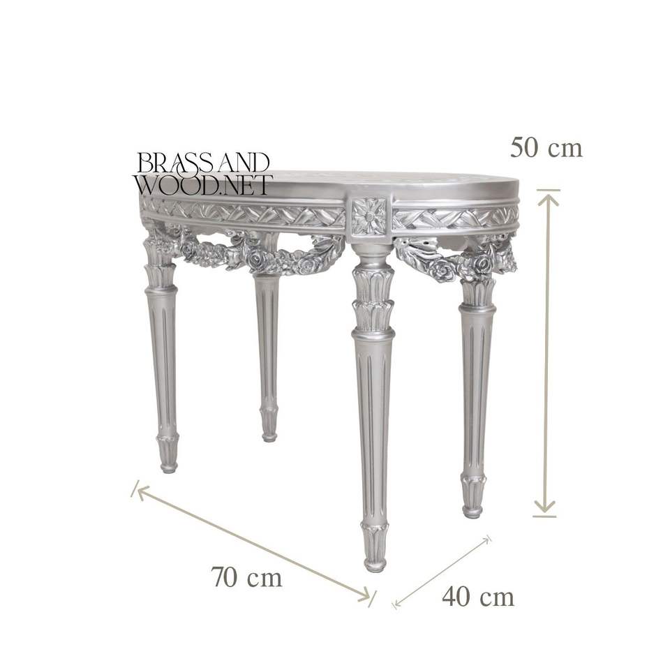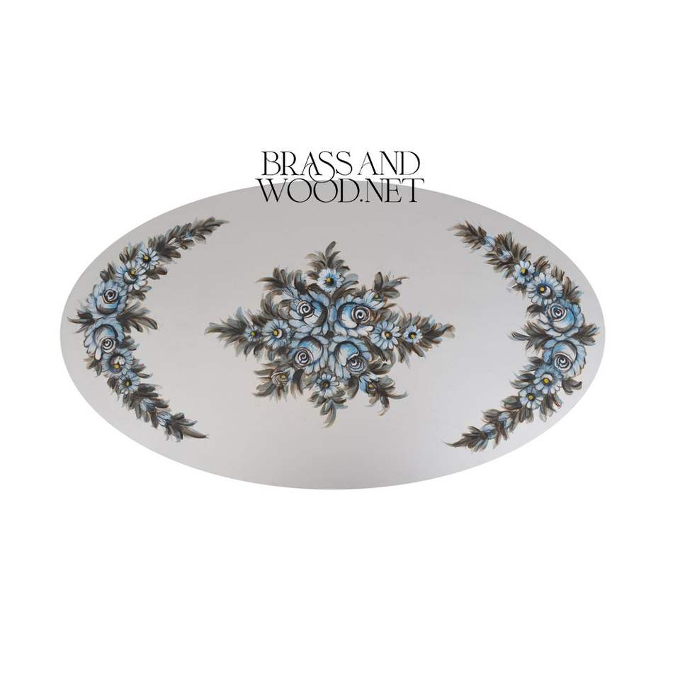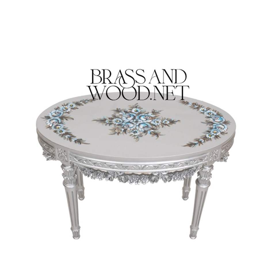 Table d'appoint ronde en argent de luxe avec bouquet floral bleu peint à la main et détails sculptés ornés pour une décoration d'angle classique de la maison