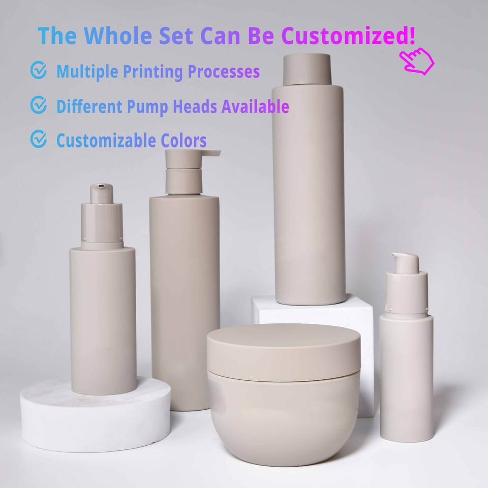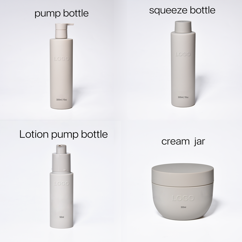 Ensemble d'Emballages Cosmétiques de Luxe Personnalisés : Flacon Pompe à Lotion, Bouteille de Shampoing, Pot à Crème et Flacon Vaporisateur avec Design en Relief