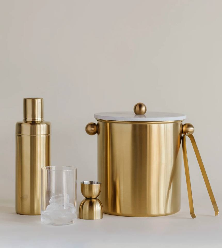 Seau à glace de luxe en acier inoxydable avec couvercle en marbre, finition dorée élégante, design isolé pour bar à domicile haut de gamme et réceptions
