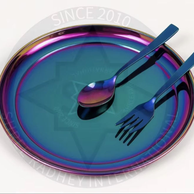 Assiette ronde en acier inoxydable de luxe + cuillère et fourchette, écologique, passe au lave-vaisselle, finition polie PVD arc-en-ciel, occasions festives