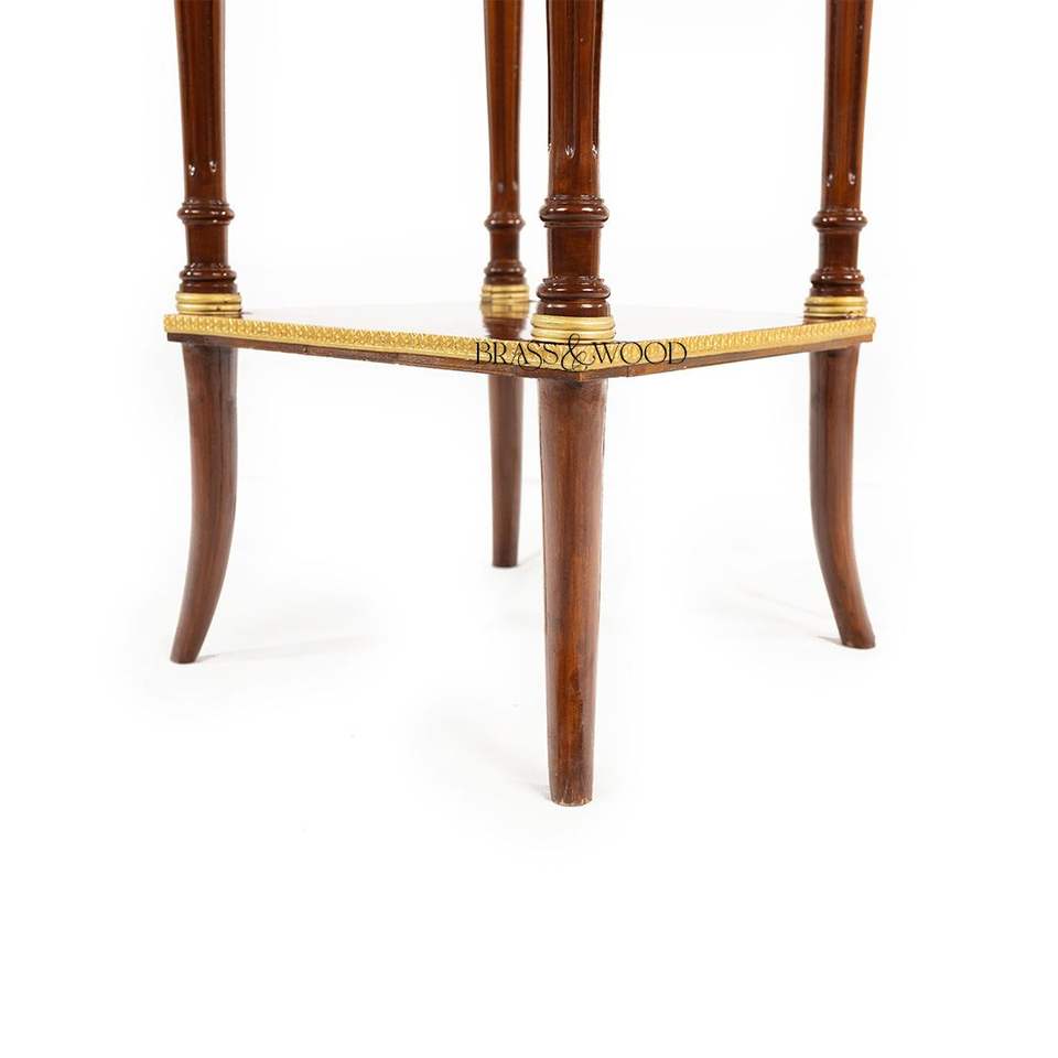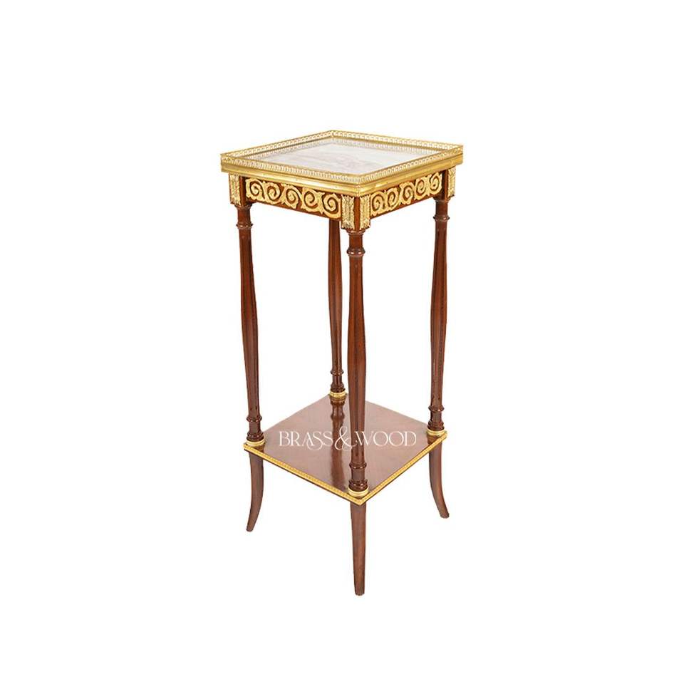 Table d'appoint carrée haute de luxe en acajou avec plateau en marbre blanc et accents en laiton doré orné pour une décoration d'angle classique de la maison