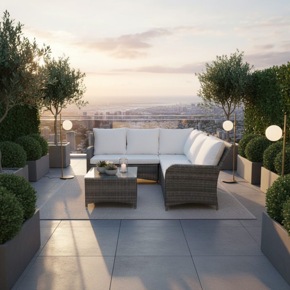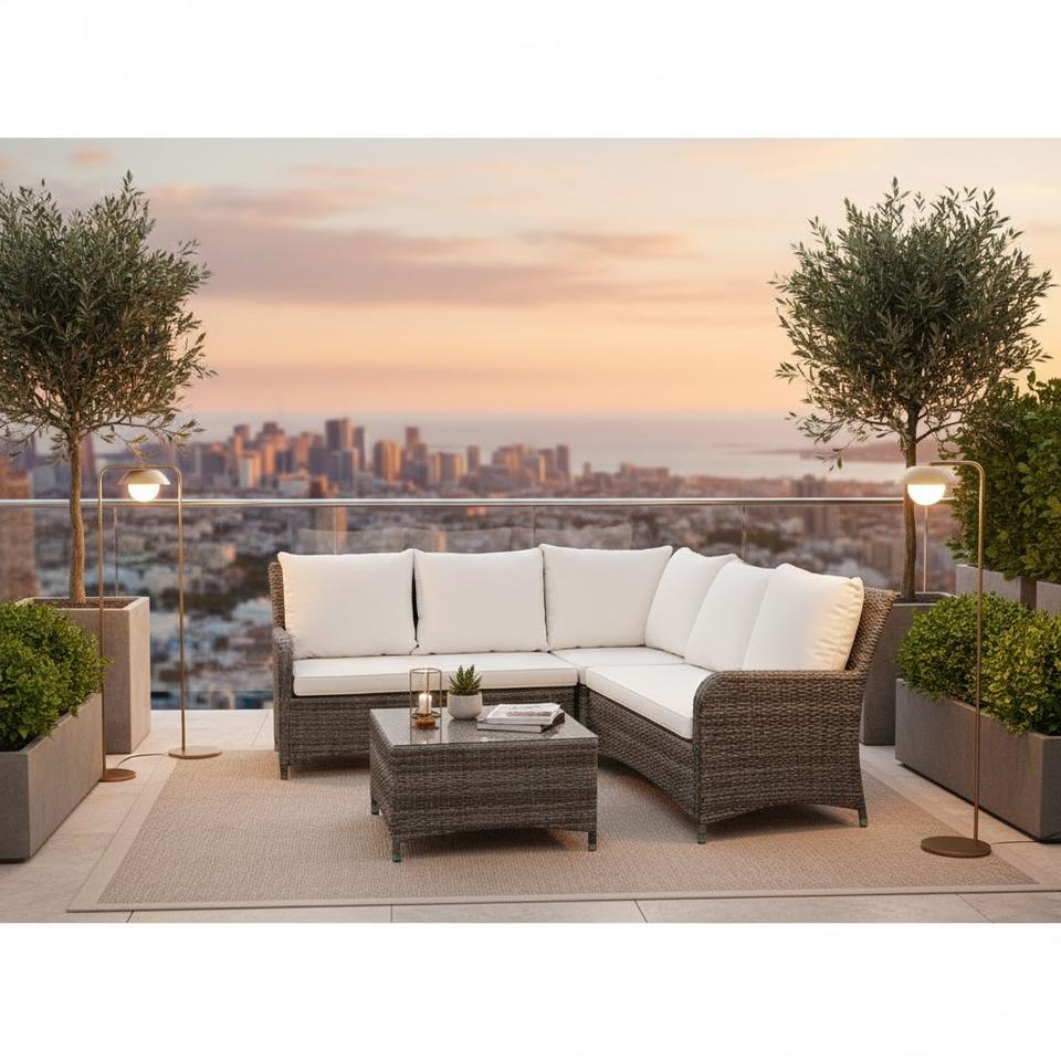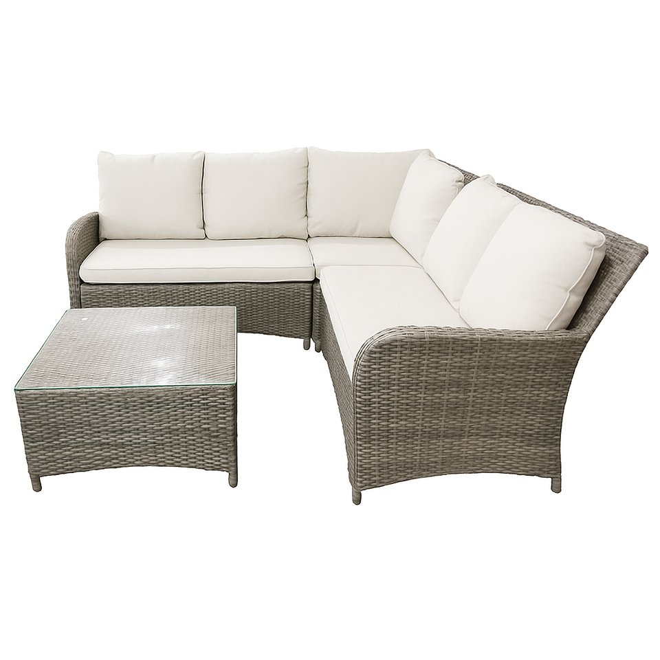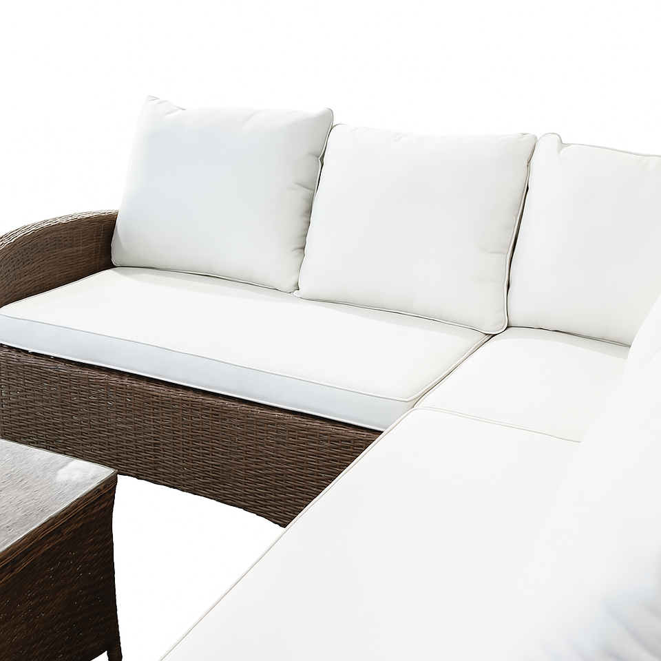 Ensemble de canapés d'angle en rotin pour l'extérieur de style traditionnel de luxe Table avec dessus en verre Coussins blancs pour Patio Garden Resort Hotel Furniture