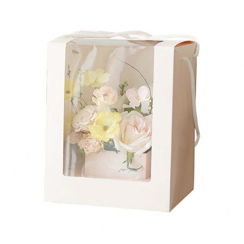 Sac en papier couché transparent de luxe, portable, avec poignées longues, ruban, matériaux recyclés, couleurs marron et blanc, emballage cadeau