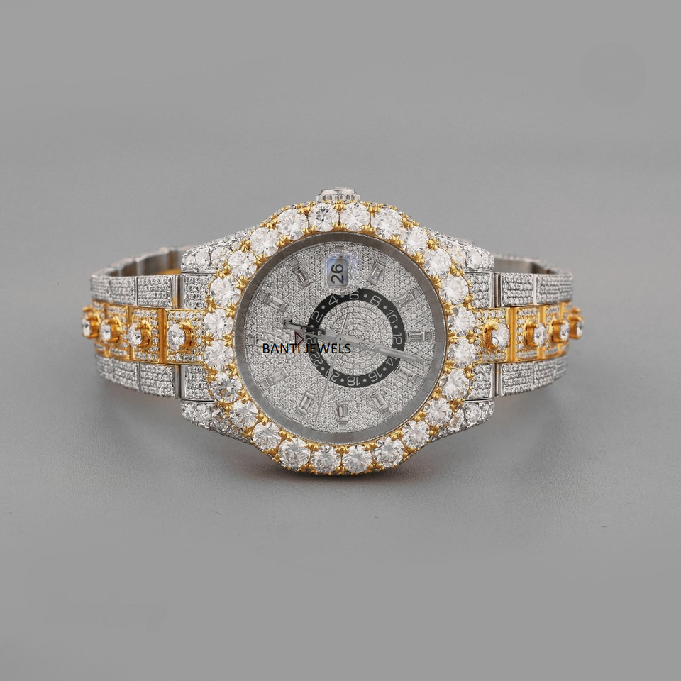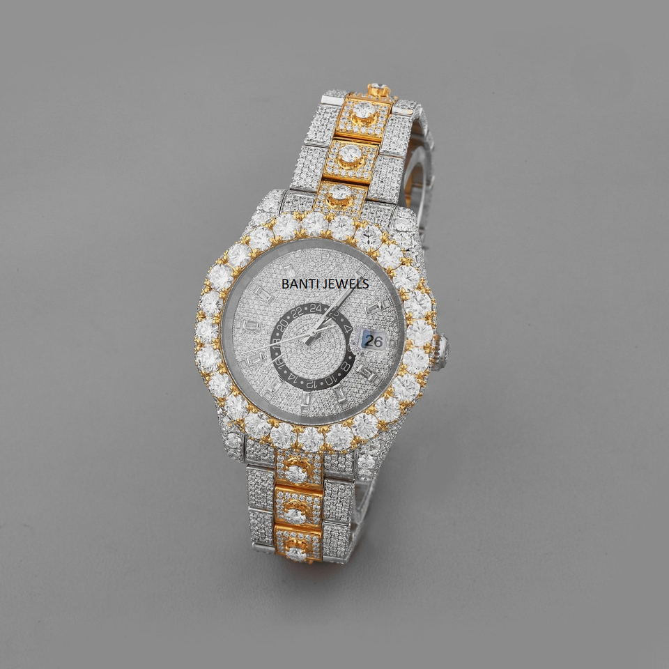 Montre de luxe à deux tons sertie de diamants en moissanite avec des accents dorés en acier inoxydable, montre personnalisée hip-hop