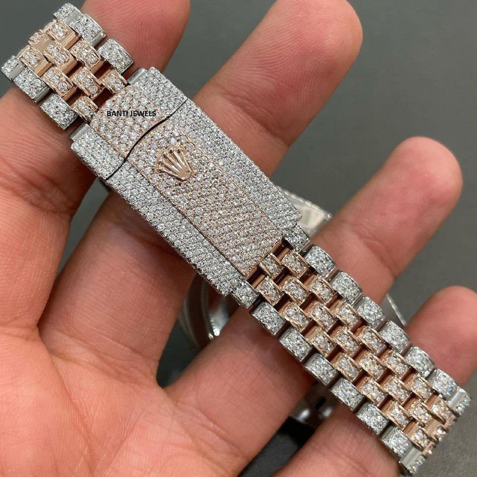 Montre de luxe bicolore or rose sertie de moissanite avec cadran rose, chiffres arabes en diamant, bijoux hip-hop