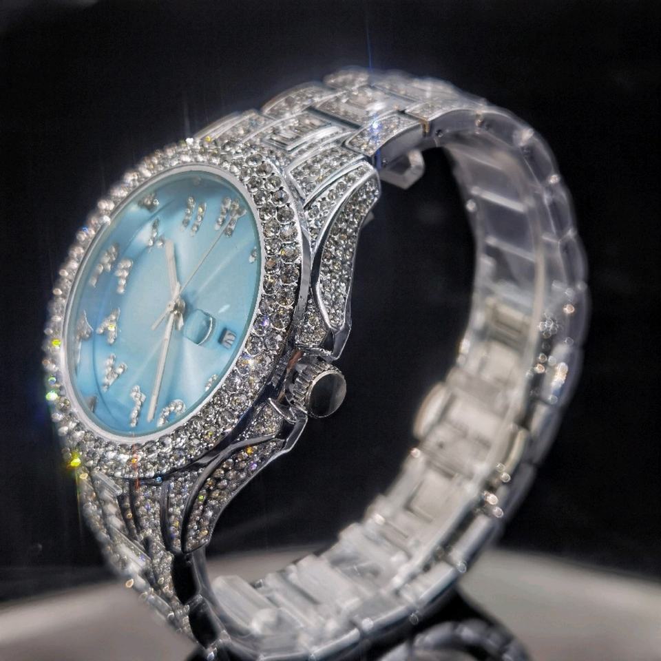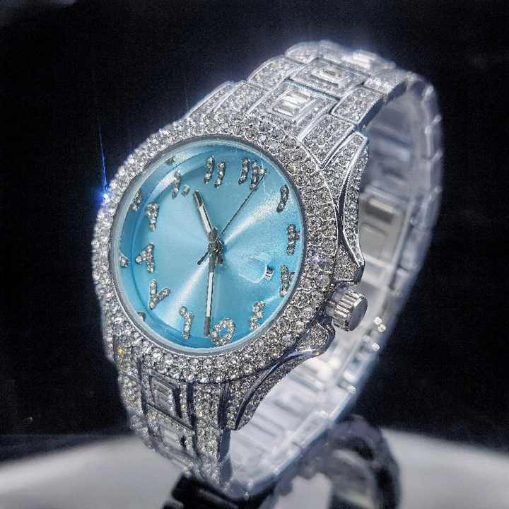 Montre de luxe unique pour homme, montre à cadran rond en argent avec chiffres arabes, montre personnalisée avec cadran serti de zircon, montre-bracelet à quartz de luxe