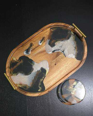 Plateau de service en bois de noyer de luxe, couleur personnalisée, résine époxy, avec poignées en forme de branche dorée, pour la décoration du Ramadan et des mariages, usage domestique et hôtelier