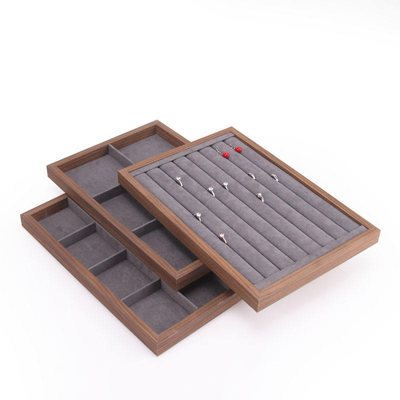 Luxury Walnut Wood Grain Gray Velvet Ring Necklace Bracelet Jewelry Display Tray Jewelry Storage Organizer Tray for Drawer
