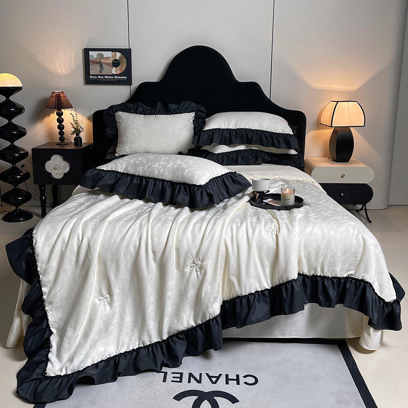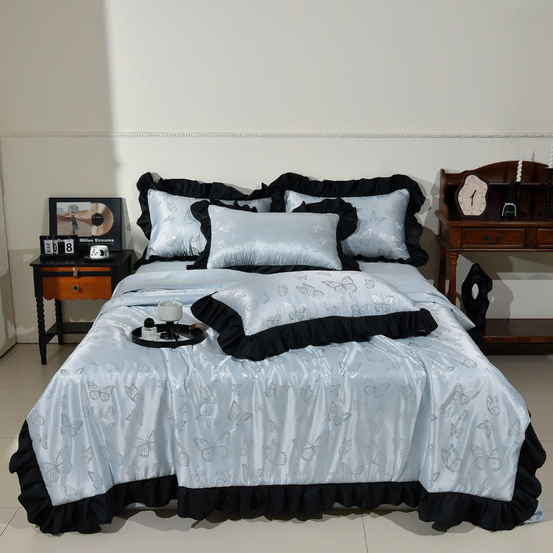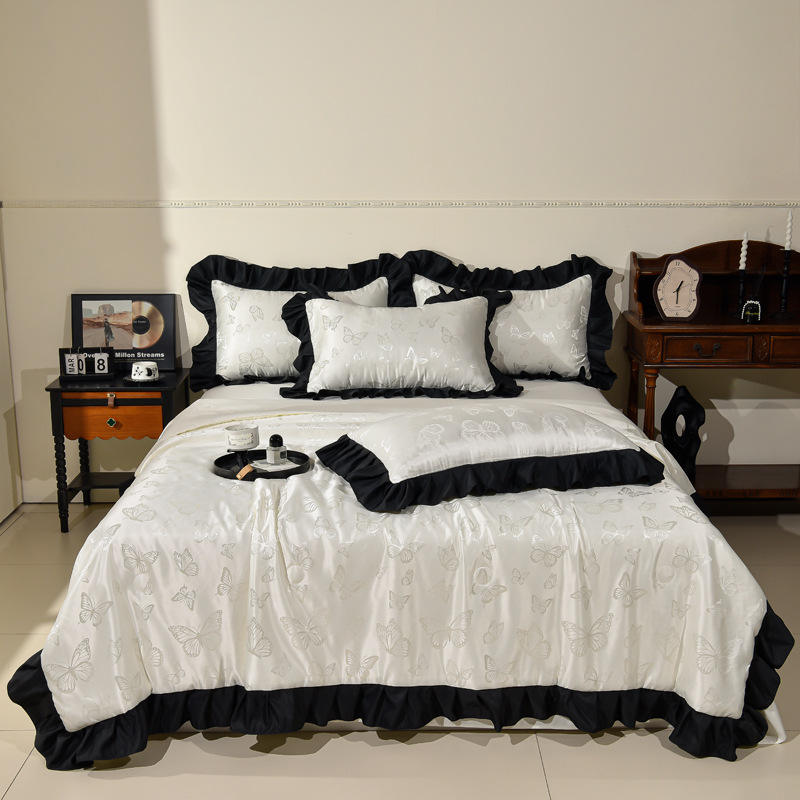 Parure de lit de luxe en soie lavée, motif papillon, bordure volantée noire, jacquard blanc, drap plat rafraîchissant et fin toutes saisons, taille Queen