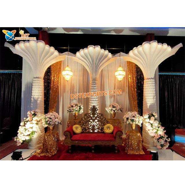 Décoration de scène de réception de mariage de luxe en Malaisie, meilleure décoration d'événement, scène de mariage élégante, piliers de scène de mariage en palmier