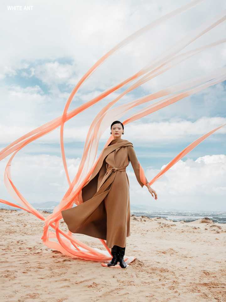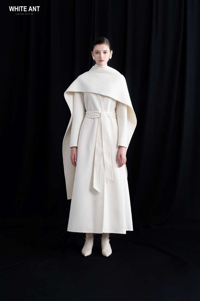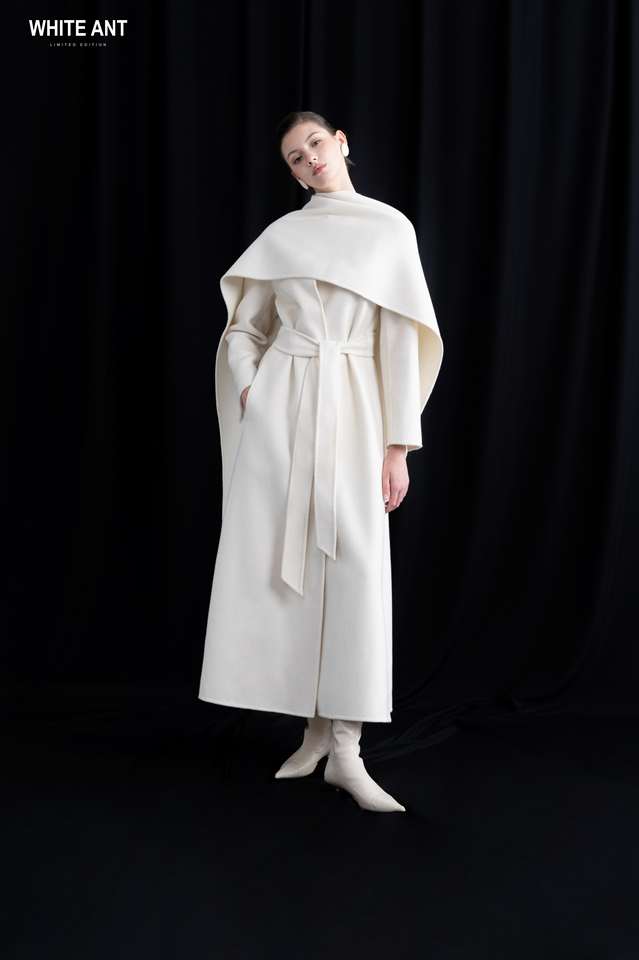 Luxury White Cashmere Fabric 20% Cashmere 80% Wool New Style MIAH CASHMERE LONG COAT Round Neck Long Coat for Women With Belt