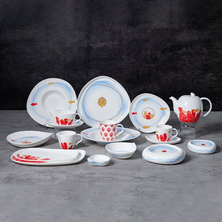 Vaisselle en porcelaine fine blanche de luxe, ensemble de vaisselle en céramique pour hôtel et restaurant, motif de récif corallien, vente en gros