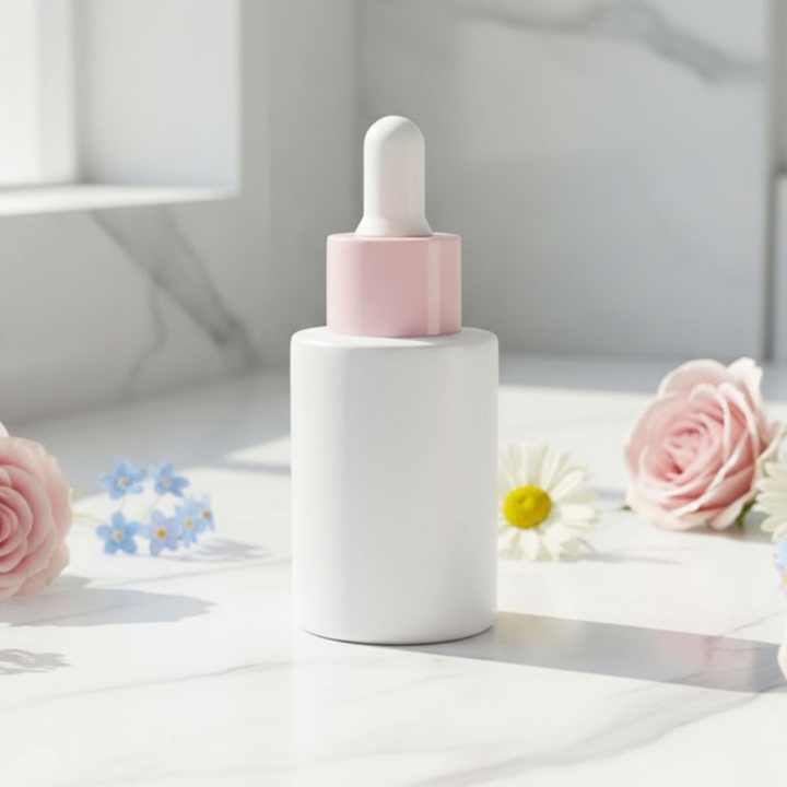 Emballage de sérum cosmétique personnalisé de luxe couleur perle blanche, flacon compte-gouttes en verre de 30 ml (1 oz) avec bouchons compte-gouttes roses