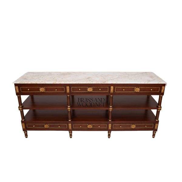 Luxury Wooden Console Cabinet with Marble Top Dual Shelves and Gold Bronze Accents Classic French Design