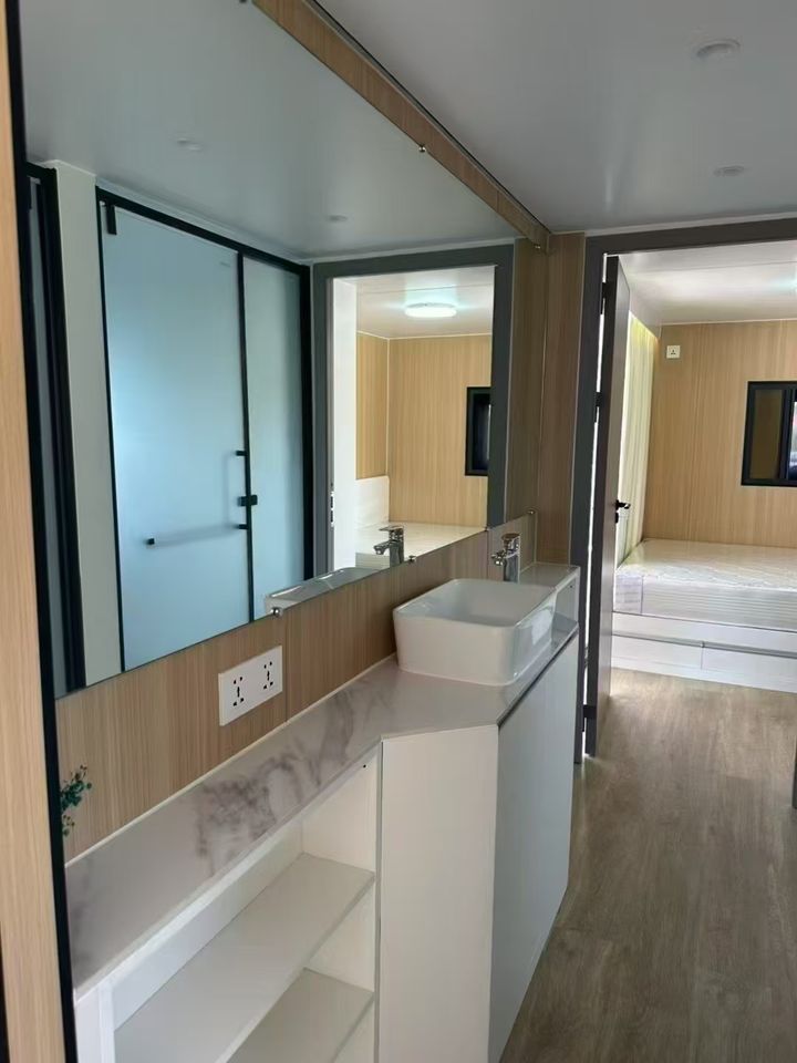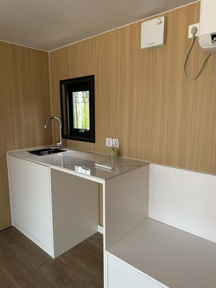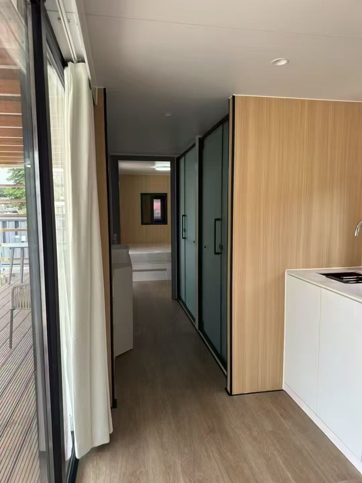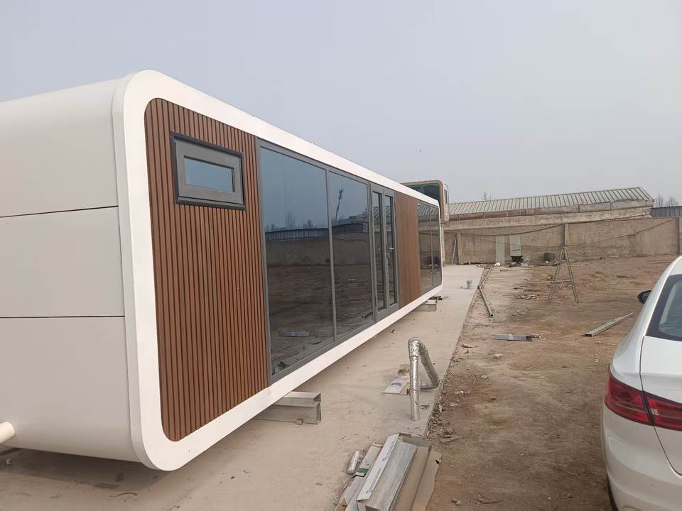 Maison de conteneur en bois et acier de luxe | Maison miniature modulaire portable | Villa préfabriquée | Hôtel capsule mobile style mid-century moderne