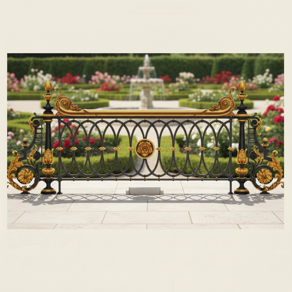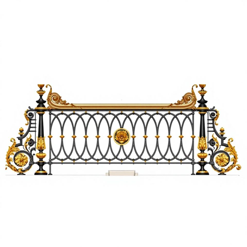 Balustrade de balcon en fer forgé de luxe, clôture décorative en métal doré, design de garde-corps pour terrasse extérieure de villa