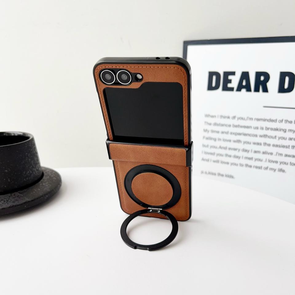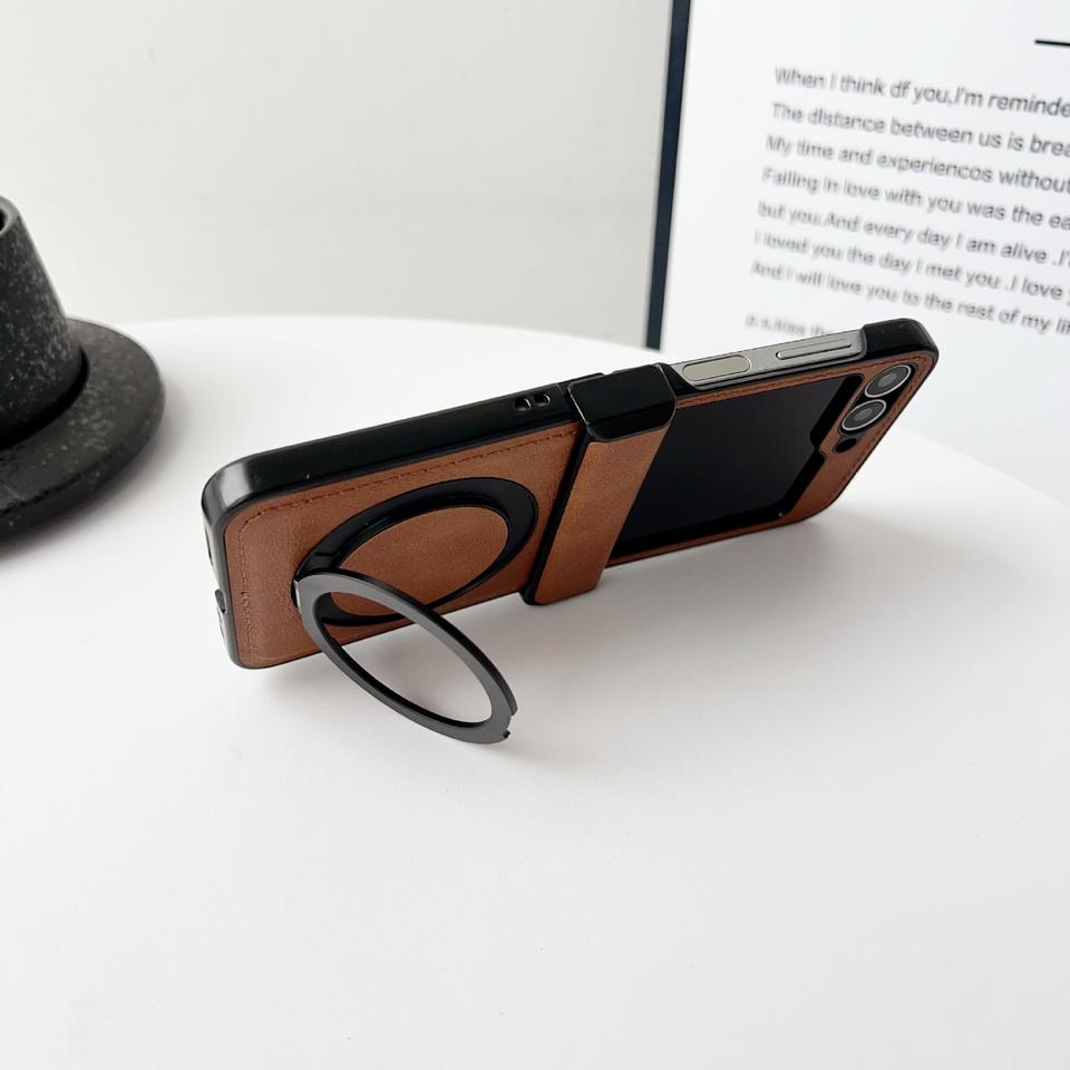 Étui de luxe en cuir PU texturé et plastique rigide pour Samsung Z Flip 7 6 5 4 3 avec support magnétique métallique inclus