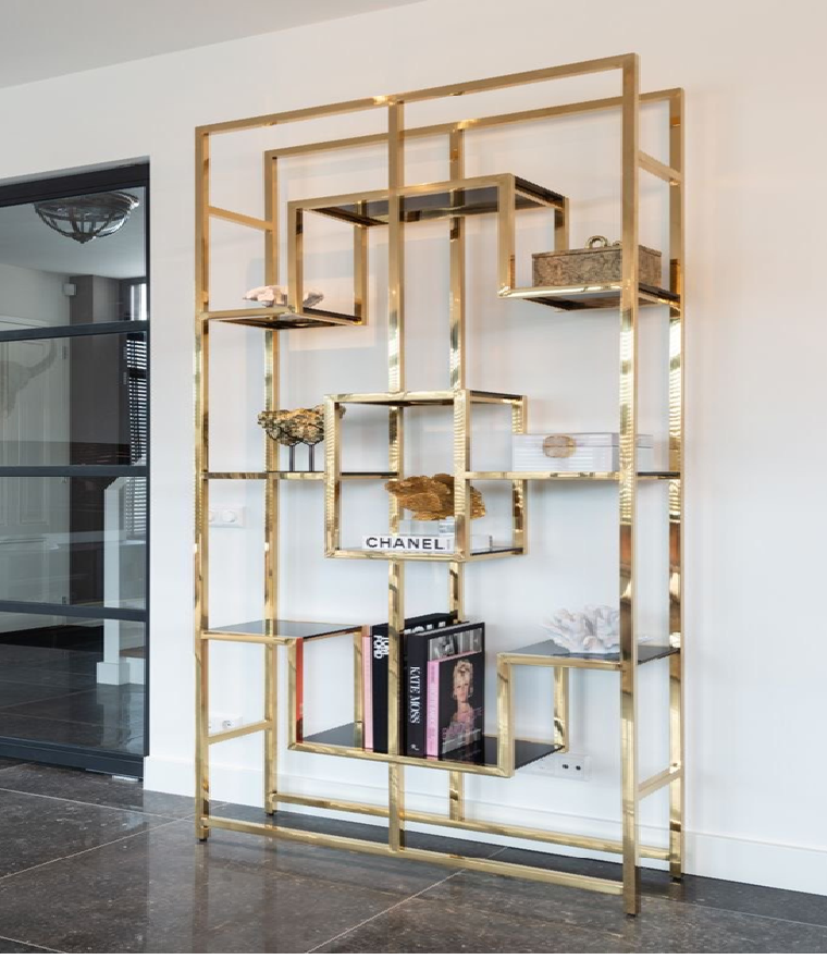 Étagère de présentation rectangulaire de luxe avec finition dorée et niveaux en verre pour livres. Disponible aux prix de gros.
