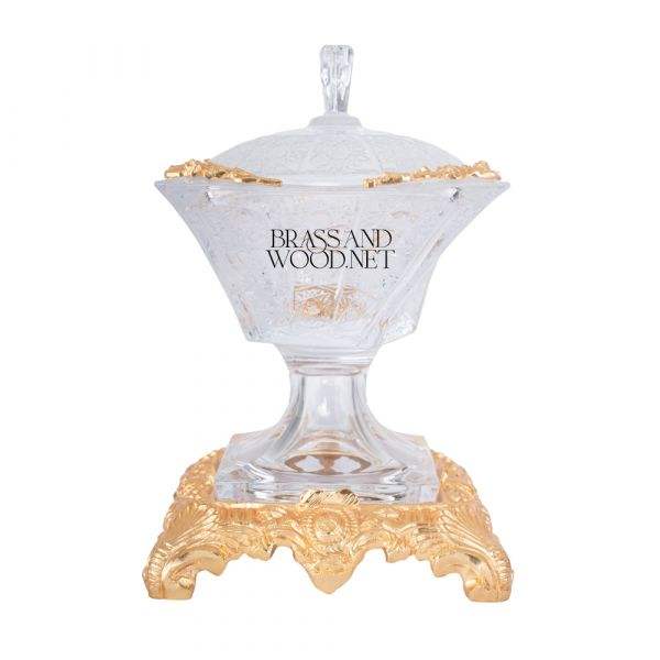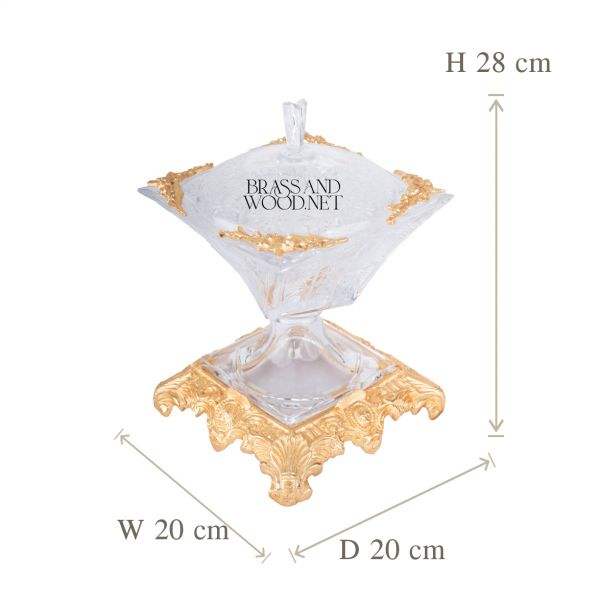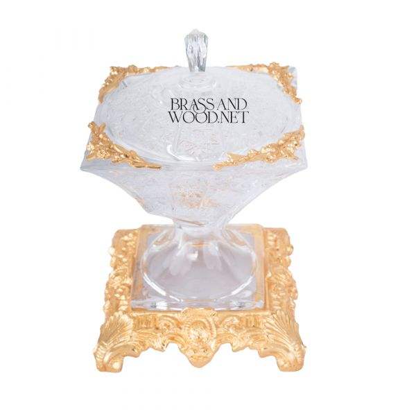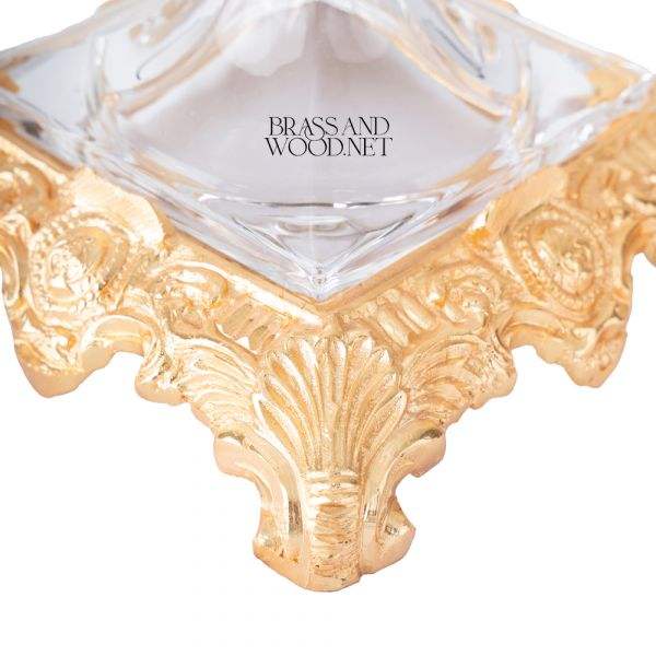 Boîte décorative carrée de luxe en laiton doré et cristal avec base sculptée ornée, couvercle élégant et détails d'angle raffinés