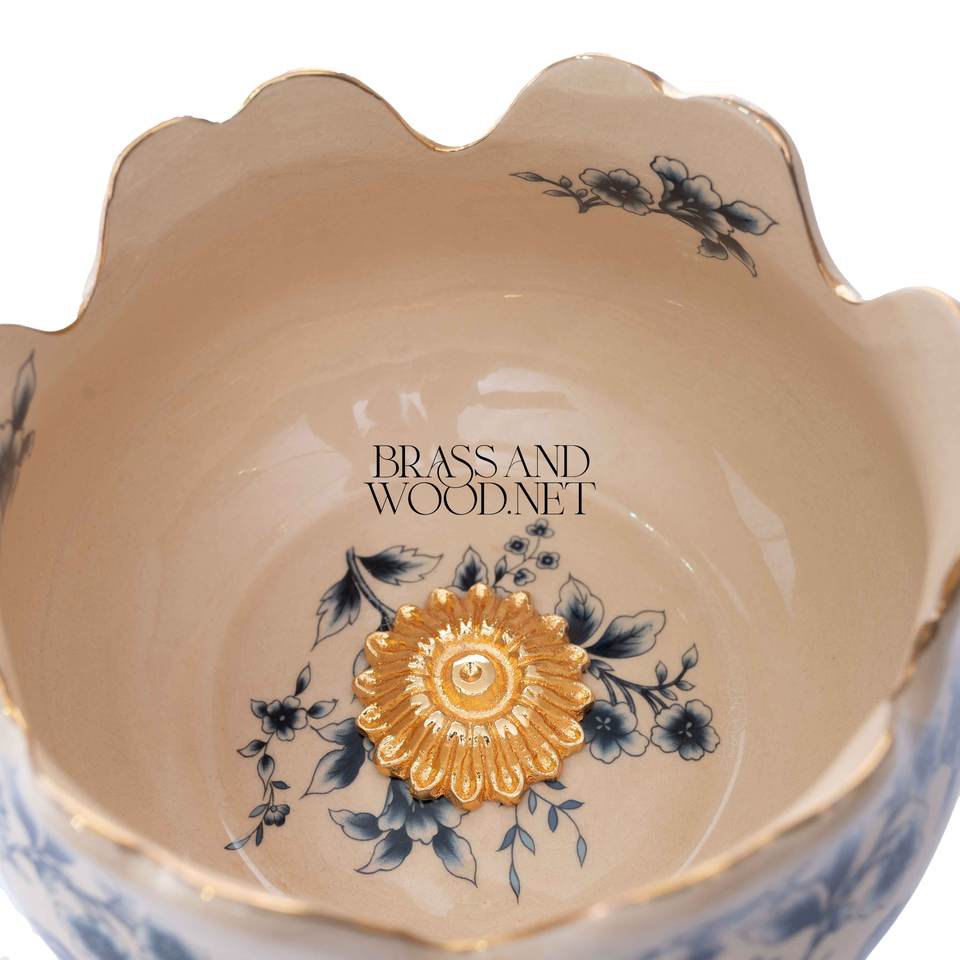 Luxury golden brass bonbonniere with floral porcelain design classic European style and ornate decorative base