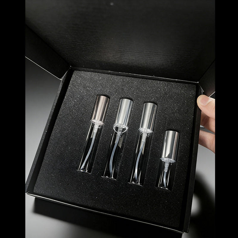 Coffret cadeau de luxe noir mat 6 flacons d'échantillons de parfum avec logo et boîte d'emballage pour flacon de sérum de soin de la peau avec mousse