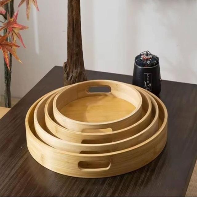 Ensemble de plateaux de service ronds en bambou de luxe avec poignées en métal doré pour hôtel, restaurant, table basse, utilisation décorative