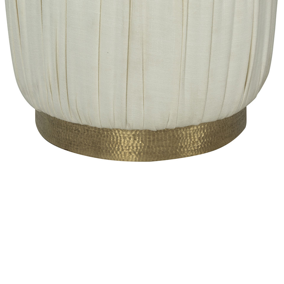 Luxury round ottoman stool with pleated fabric upholstery and hammered brass base for stylish hotel lobby and modern living room