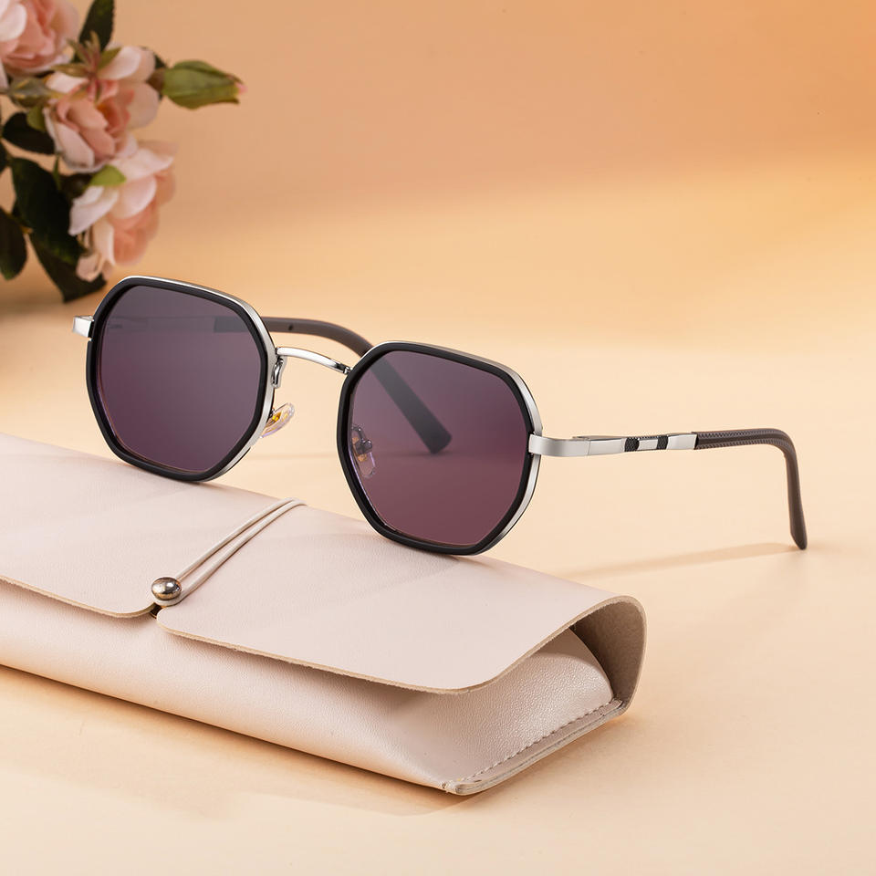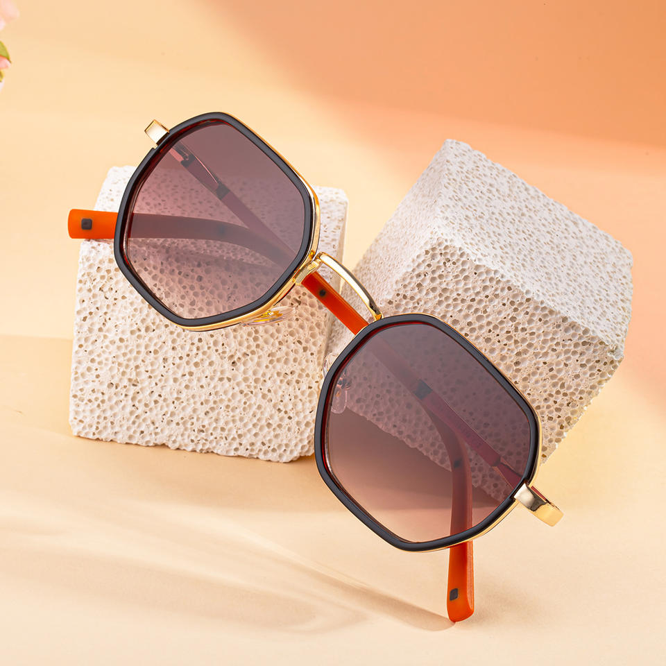 Lunettes de soleil polygonales à monture carrée Ly-98424 pour femmes, monture en plastique noir et métal, verres PC, protection UV400, style extérieur
