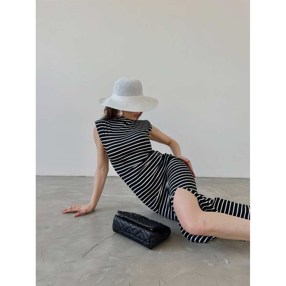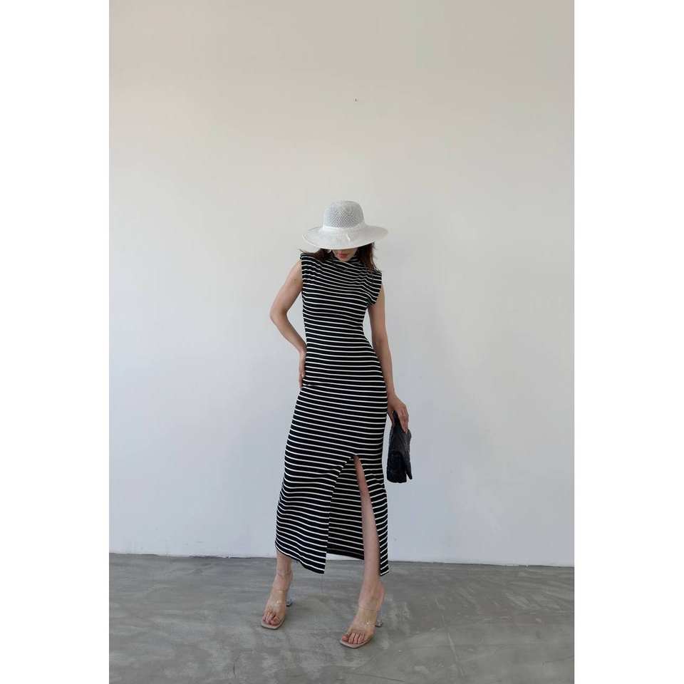 Robe moulante rayée en Lycra à col montant, taille naturelle, détail fente moderne, tenue de soirée en tissu respirant