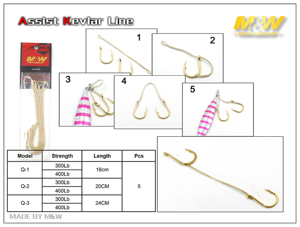 M&W Professional 5 pièces/paquet Ligne d'assistance au jigging en Kevlar 300/400LB 16/20/24cm Flottante pour Lac, Rivière et Ruisseau