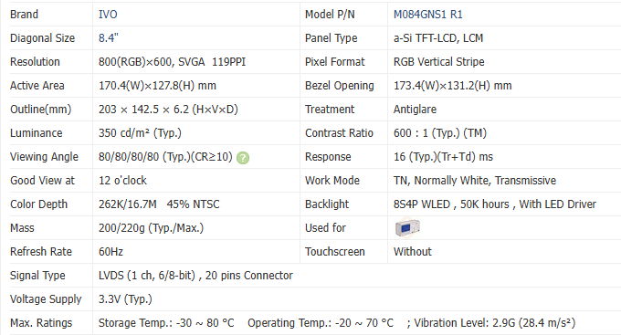 Module LCD TFT SVGA 8,0 pouces de qualité industrielle M084GNS1 R1, rétroéclairage WLED LVDS 20 broches, température de fonctionnement -20~70°C, écran panneau