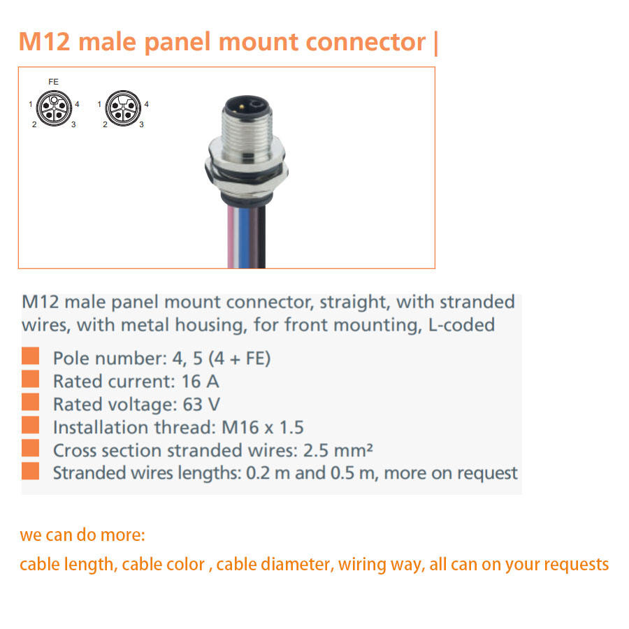 Connecteur M12 pour montage sur panneau : Codage L, Mâle-Femelle, 4 ou 5 pôles, Courant 16A, IP67, Câble PVC de 0,5 m (longueur personnalisable)