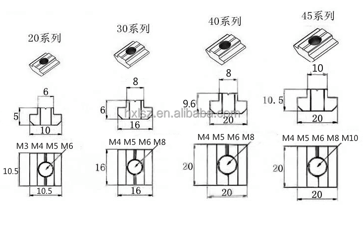 Écrous coulissants en T pour profilés en aluminium, série M3 M4 M5 M6 M8 M10 20 30 40 45