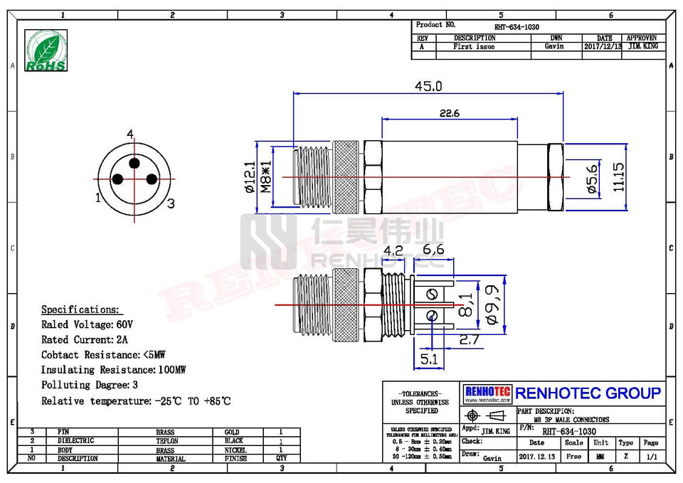 Courant évalué:3A pour 3/4/5 goupille, 1.5A pour 6/8pin