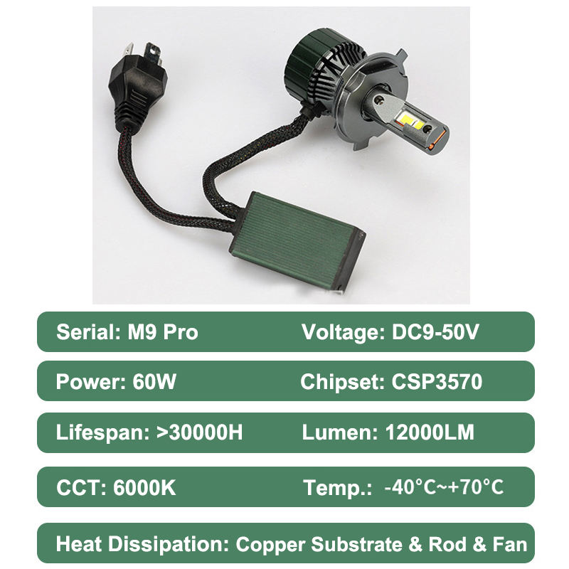 Ampoules de phares LED pour voiture M8 Pro Version Améliorée M9 Pro H1 H3 H7 H11 H4 9005 9006 9012 880 881 DC9-50V 60Watts 6000K Blanc 2-Pack