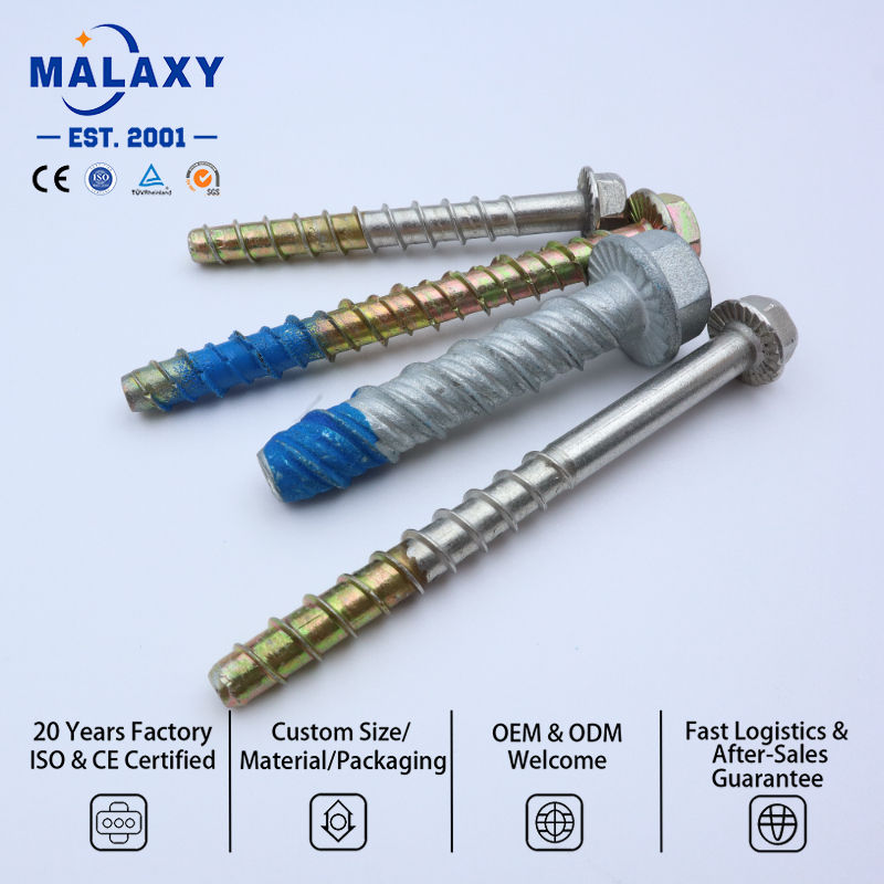 Vis à béton MALAXY en acier inoxydable à tête hexagonale, zinguée bleu, classe 10.9, en stock et livraison rapide pour fixations de construction