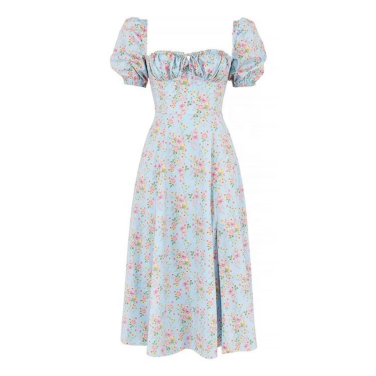 MANNI Manches Bouffantes Cravate Bustier Ruché Col Carré Robe Florale Fente Causal Robes Midi