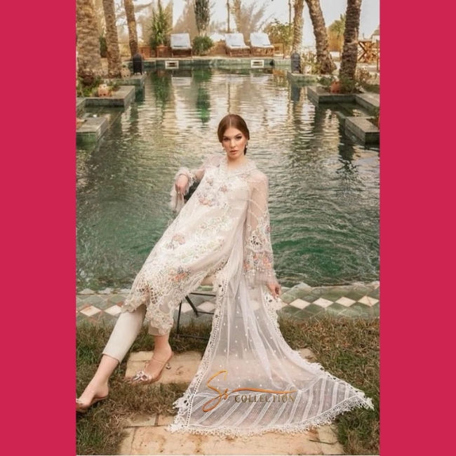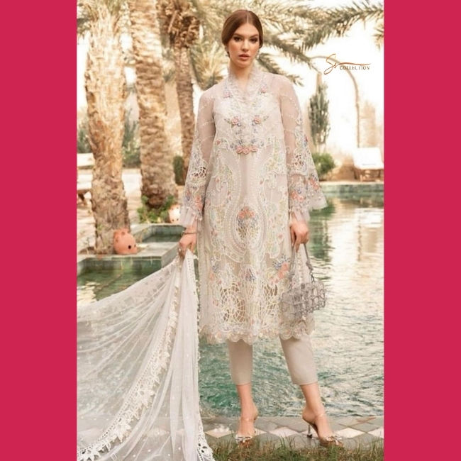 Dupatta artisanal Maria B en organza artistique, orné de fils de perles, de séquences, de découpes au laser, de broderies et de tissu en filet