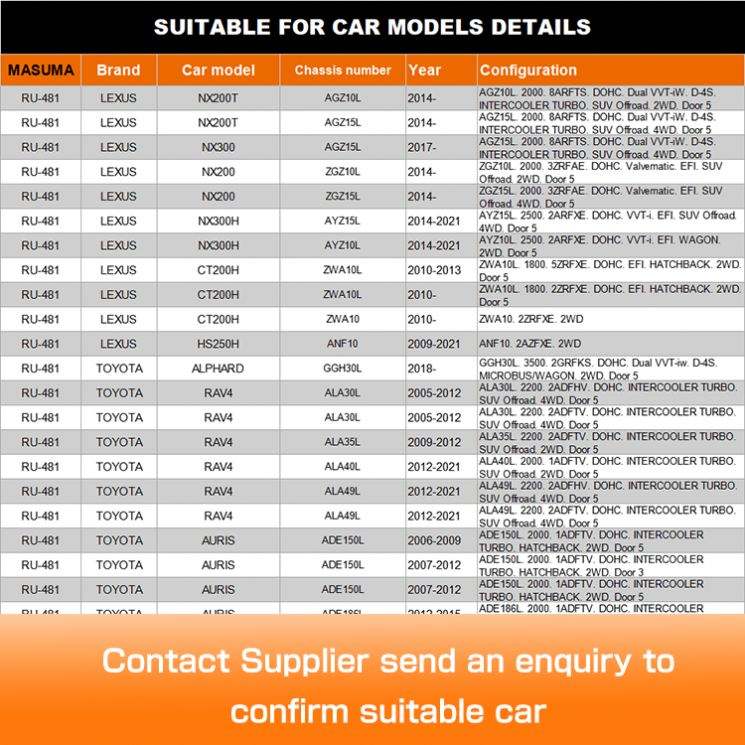 MASUMA Pièces en caoutchouc automobile RU-481 Composants de remplacement de voiture avant arrière durables 1NZFE NZE184H 48068-02130