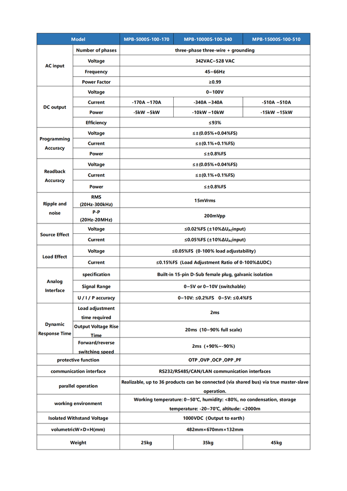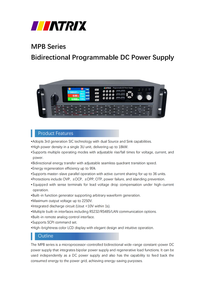 Alimentation électrique bidirectionnelle programmable à affichage numérique à quatre chiffres de la série MATRIX MPB, haute puissance, 15 kW, 100 V, 510 A, métal