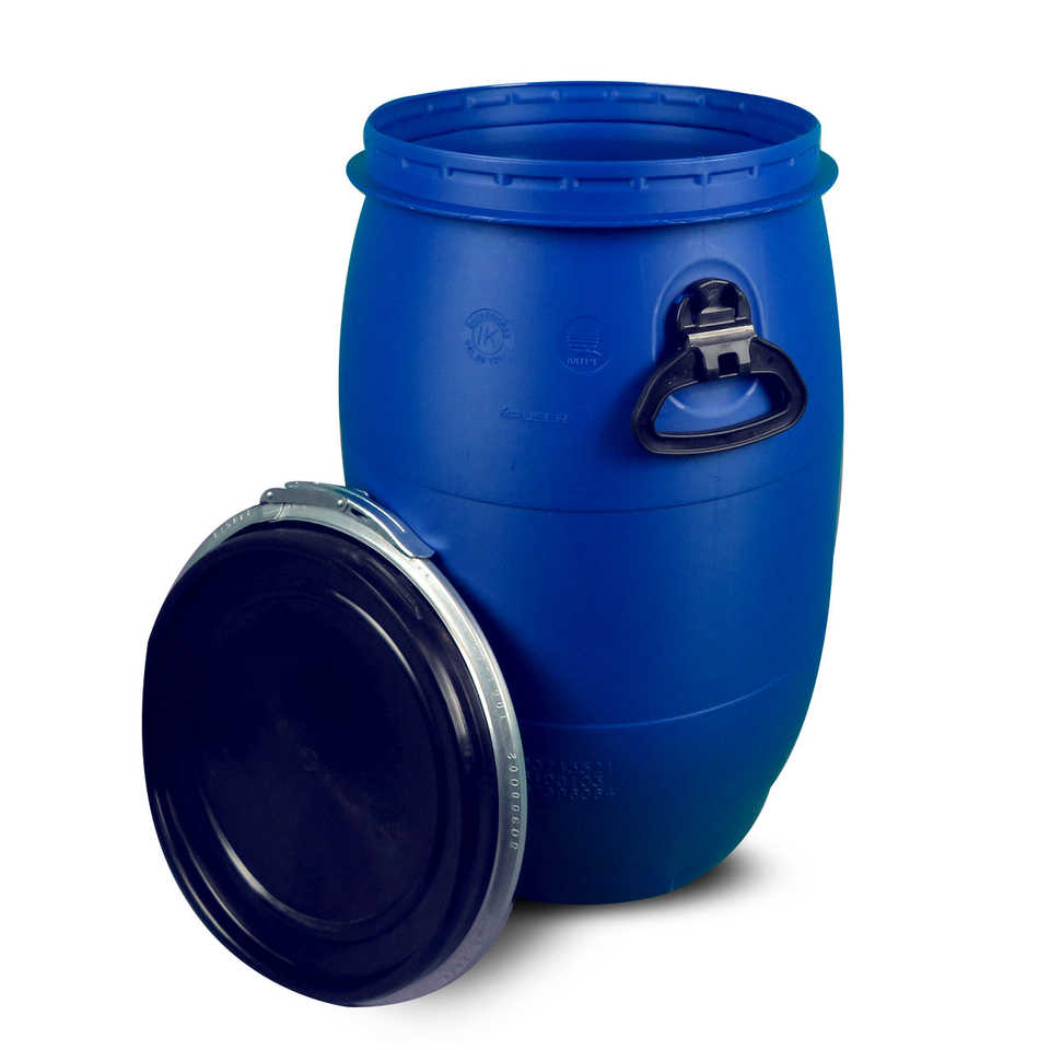 Fût à large ouverture de 60 L / fût avec couvercle en plastique, bleu, conforme aux normes alimentaires, MAUSER, ONU