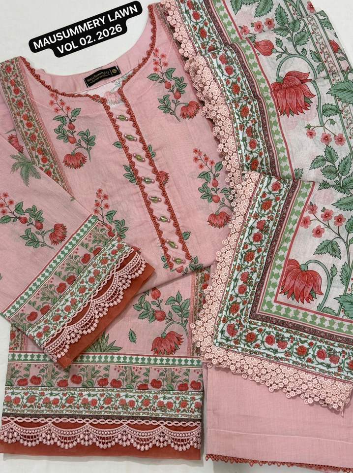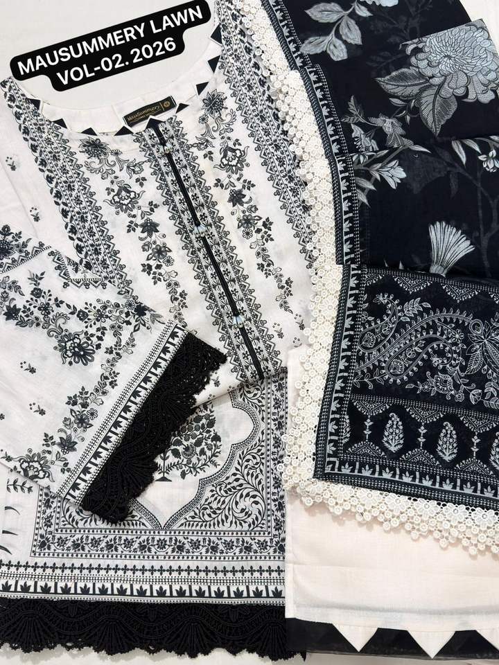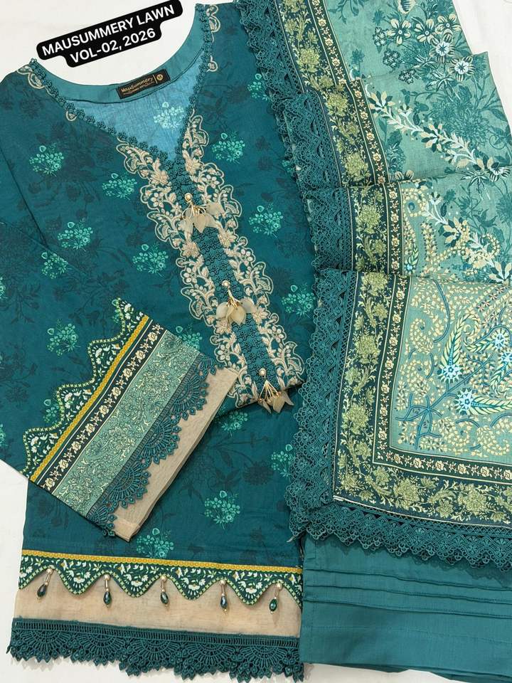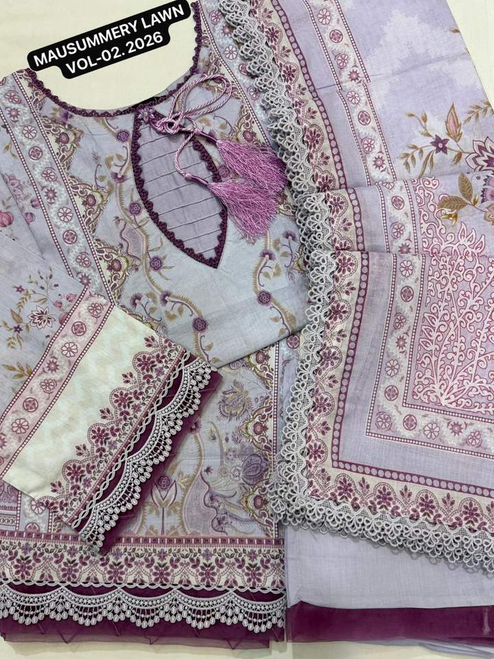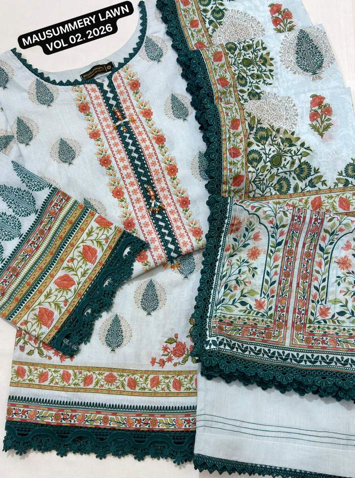 MAUSUMMERY LAWN VOL-2 Ensemble 3 pièces brodé prêt-à-porter en coton pour fête d'été, comprenant chemise, dupatta et salwar en dentelle