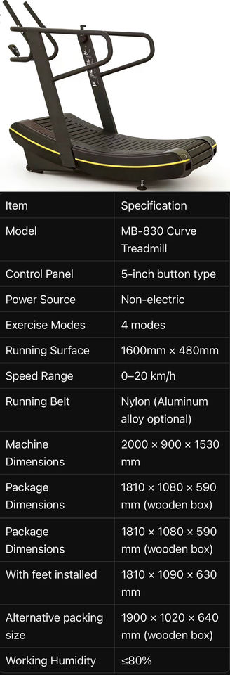 Tapis roulant commercial incurvé MB-830 avec écran LED, entraînement mécanique manuel, design écologique, cadre portable, vitesse de 20 à 25 km/h